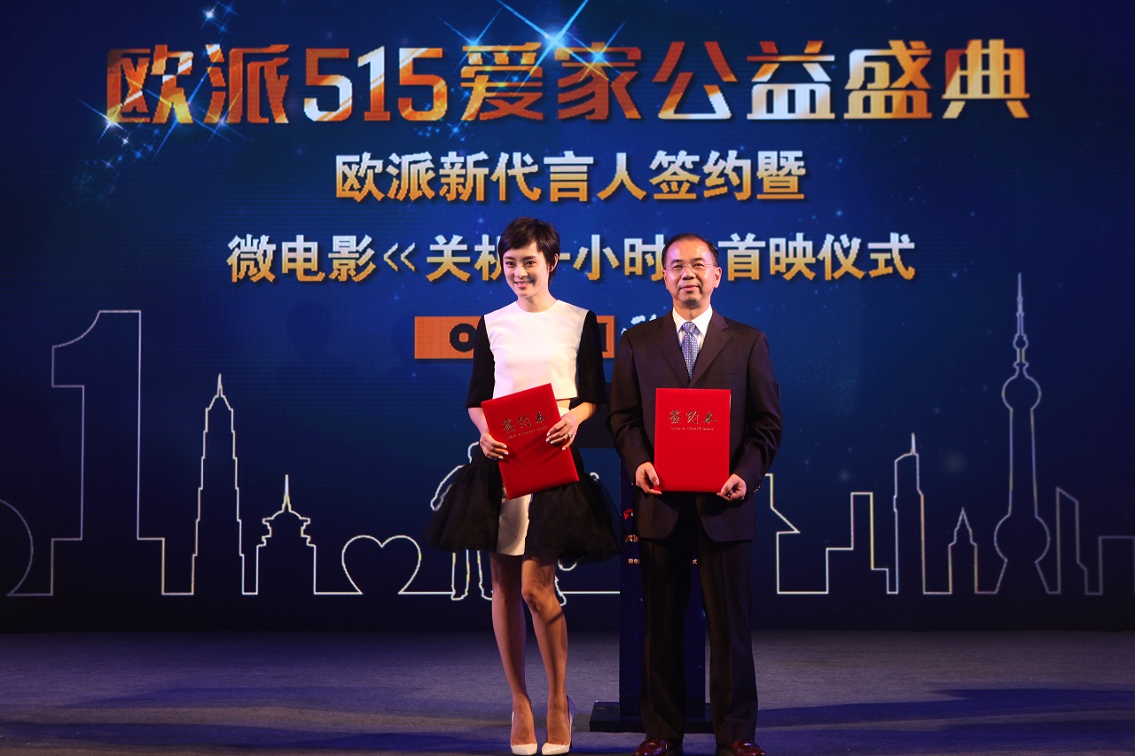 2015年5月15日,第22個國際家庭日,歐派515愛家公益盛典在上海浦東文華東方酒店隆重舉行。在這場為公益鼓與呼的盛典中,孫儷、周冬雨、李行亮等明星齊聚一堂,與歐派家居集團(tuán)共同發(fā)出“為愛關(guān)機(jī)一小時(shí)”的倡議,呼吁社會關(guān)注家庭健康問題,用心陪伴家人。在盛典上,孫儷正式簽約歐派家居集團(tuán),成為歐派新任品牌形象代言人和愛家大使。同時(shí),由歐派斥資拍攝、90后人氣明星周冬雨主演的公益微電影《關(guān)機(jī)一小時(shí)》也在盛典上舉行了首映禮。