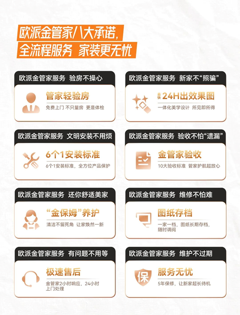 不僅如此,歐派家居還有著更為宏大的品牌升級規(guī)劃。歐派家居上線“金管家服務(wù)”,推出管家輕驗(yàn)房、24H出效果圖、6個(gè)1安裝標(biāo)準(zhǔn)、金管家驗(yàn)收、“金保姆”養(yǎng)護(hù)、圖紙存檔、極速售后、服務(wù)無憂八大承諾,為消費(fèi)者提供“高質(zhì)高效”服務(wù),讓消費(fèi)者享受“省時(shí)省力”體驗(yàn)。